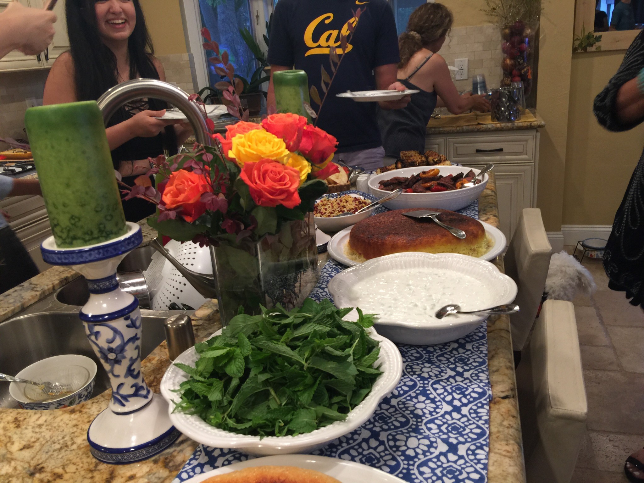 Persian hospitality is generous. They have an appreciation for aromatic flavors such as saffron and fresh herbs like mints … then dreamy scents of rose water and orange blossoms:) while fresh fruits are plentiful and rainbow of fresh vegetables are abundant. My friend works away in the background making sure all her guests are at home and well fed – but after she makes sure that all her guests are well taken cared of, she would kick up her heels and dance with a wine glass in one hand! Where’s the music ? She calls out to her handsome son who then becomes a DJ, lol, while her partner busily fills the guests’ glasses.