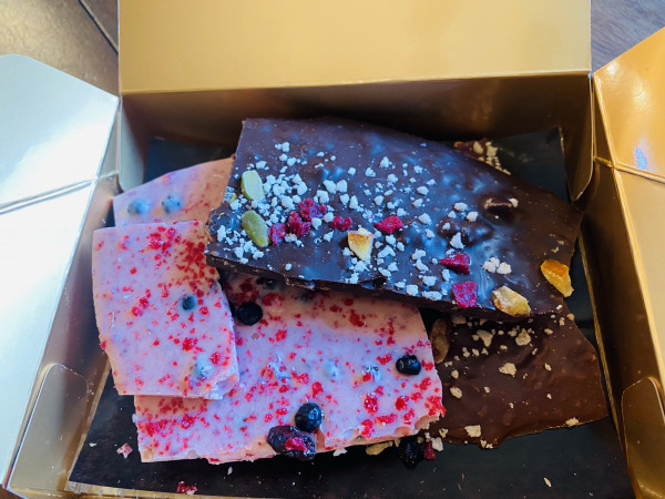 Pretty and Yummy 🙂 The latest fad? They have different flavors of chocolate balks – make an assortment. The berry flavors were the best:)