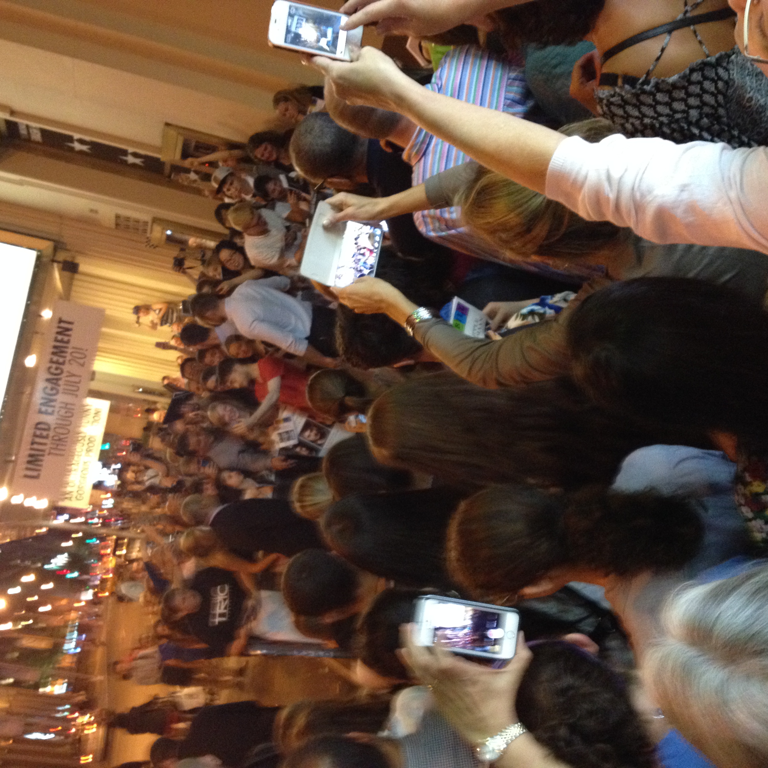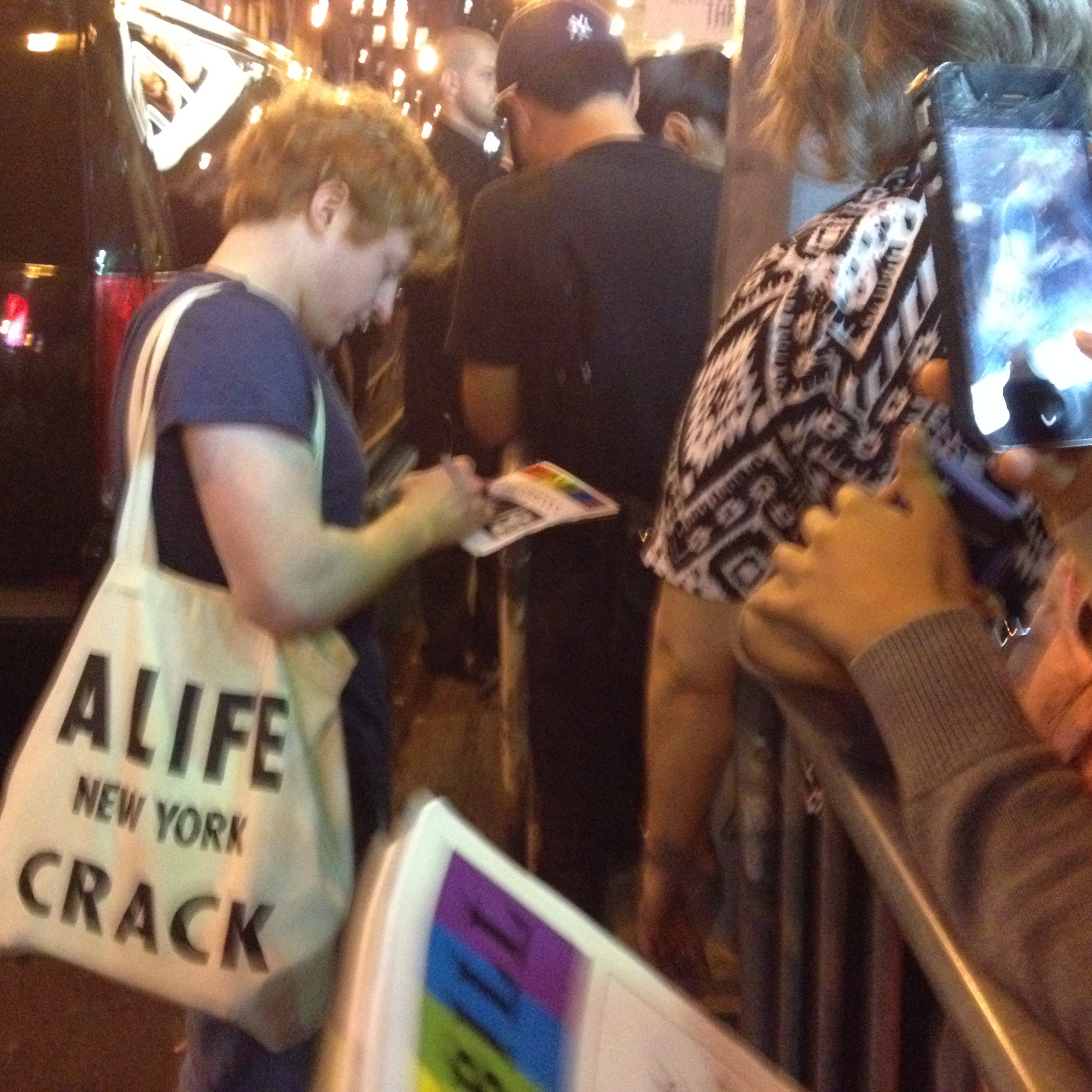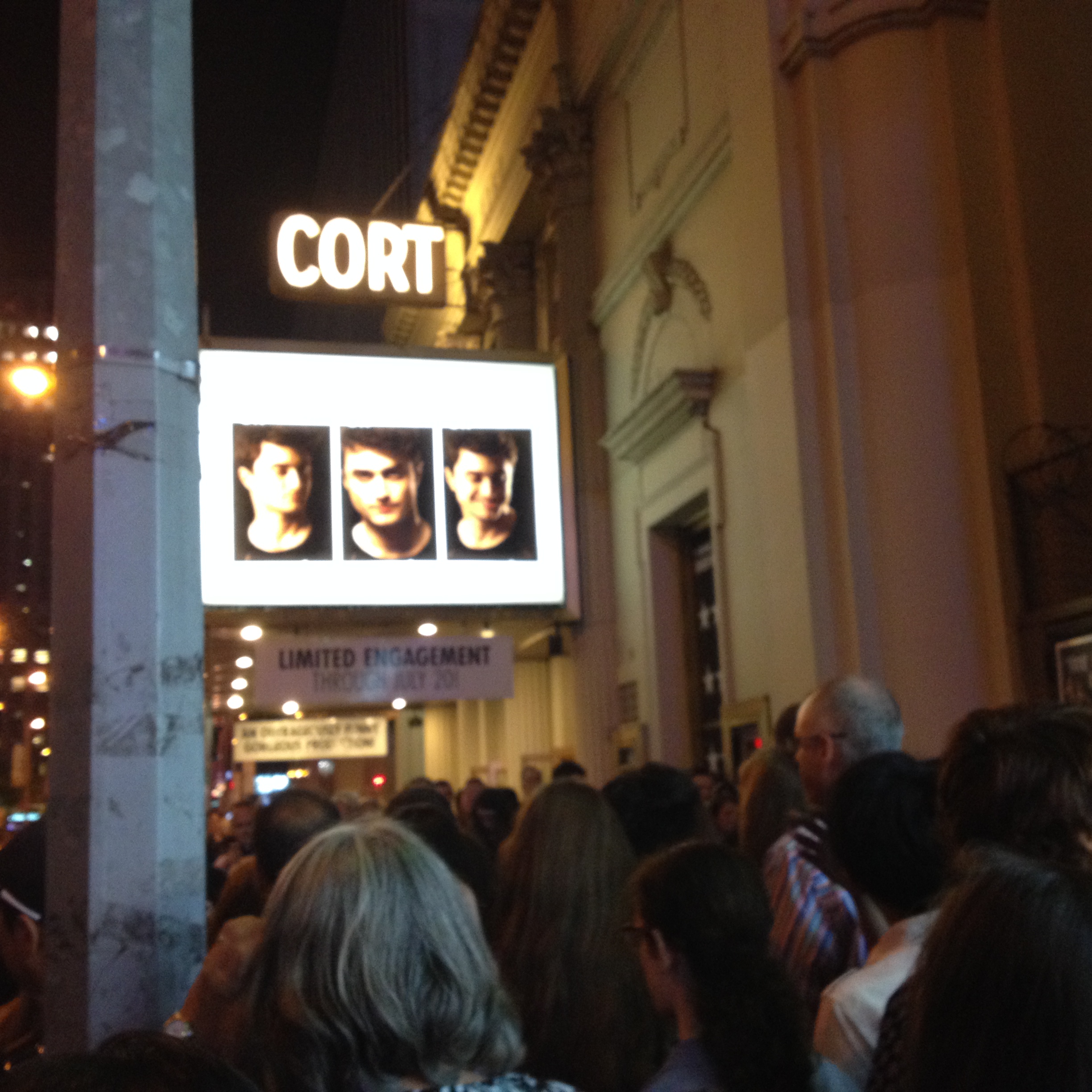 Daniel Radcliffe in red shirt… walls of bodies of adoring fans blocked our way … other cast members slipped away with relatively little attention as they came out and disappeared into neon lit Broadway night – They had that cool look of authentic starving artists. All the while huge crowd continued to gather and formed a mushroom mass around the star’s chauffeured and high security limo… fame (star of a franchise in which all eight films make the list for the top 50 grossing films of all time) and fortune (reported net worth of $110MM…) in hands at ripe old age of 25.