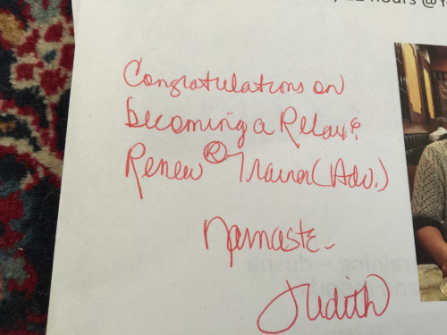 A lovely note from Judith Lasater upon completing my advance training and a final project report.